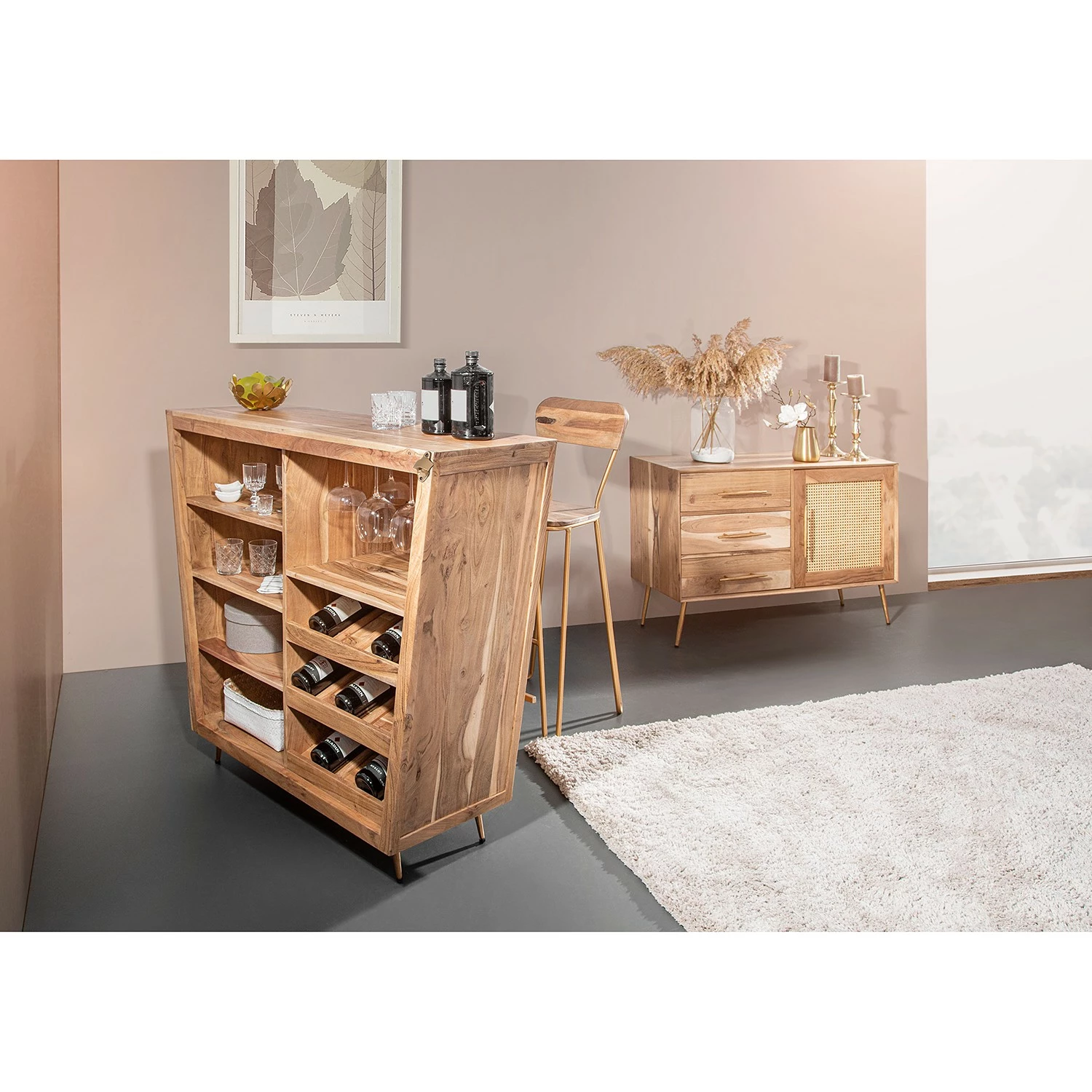- Façade : rotin / acacia massif fumé et verni