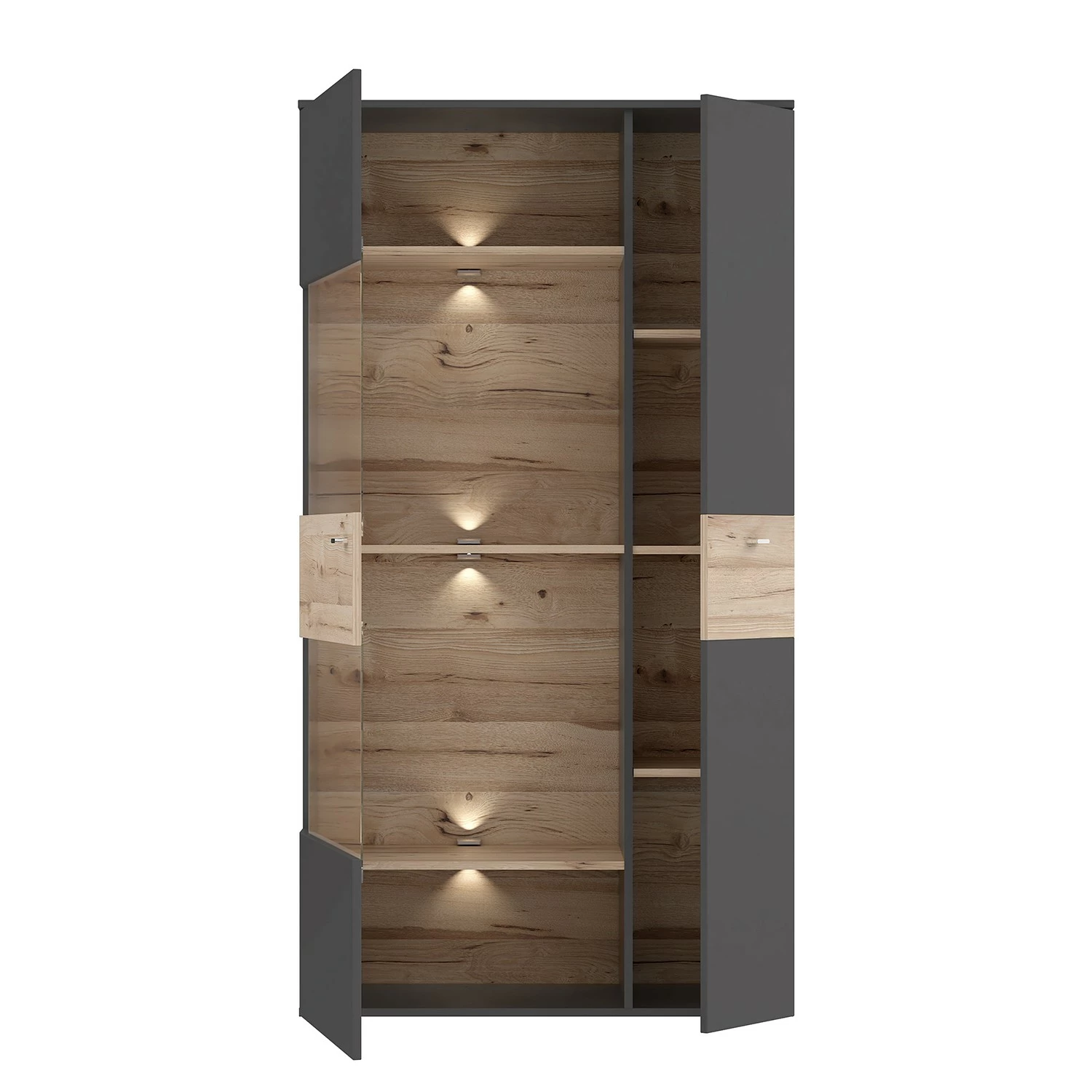 - Contenu de la livraison : Ensemble comprenant 1 vitrine, 1 tablette murale, 1 meuble TV et 1 buffet haut, avec éclairage et sans accessoires