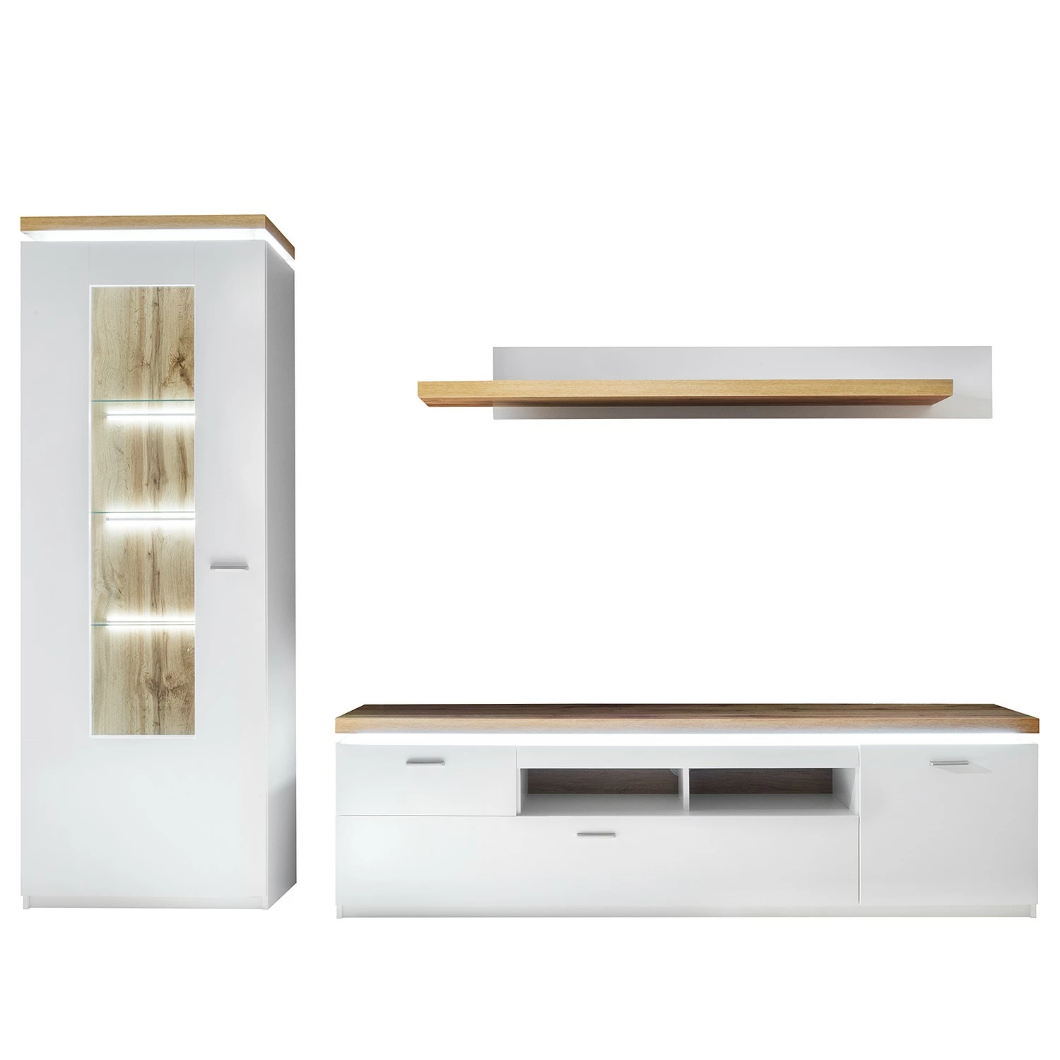 - Contenu de la livraison : 1 vitrine, 1 meuble TV et 1 tablette murale avec éclairage, sans accessoires
