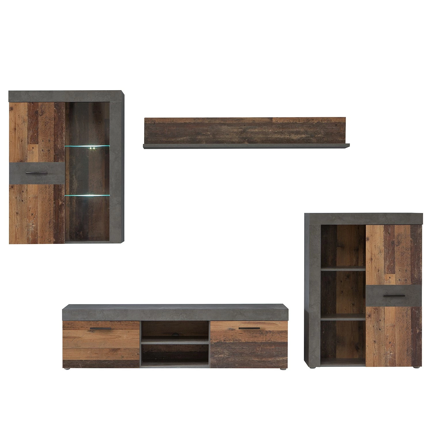 - Contenu de la livraison : Ensemble comprenant 1 armoire suspendue, 1 tablette murale, 1 meuble TV et 1 buffet, sans éclairage ni accessoires