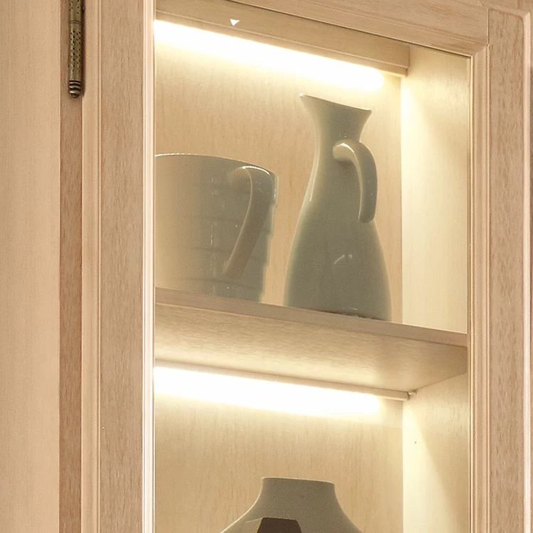 - Vitrine gauche : 1 porte en bois / verre avec butoir à gauche et 4 tablettes