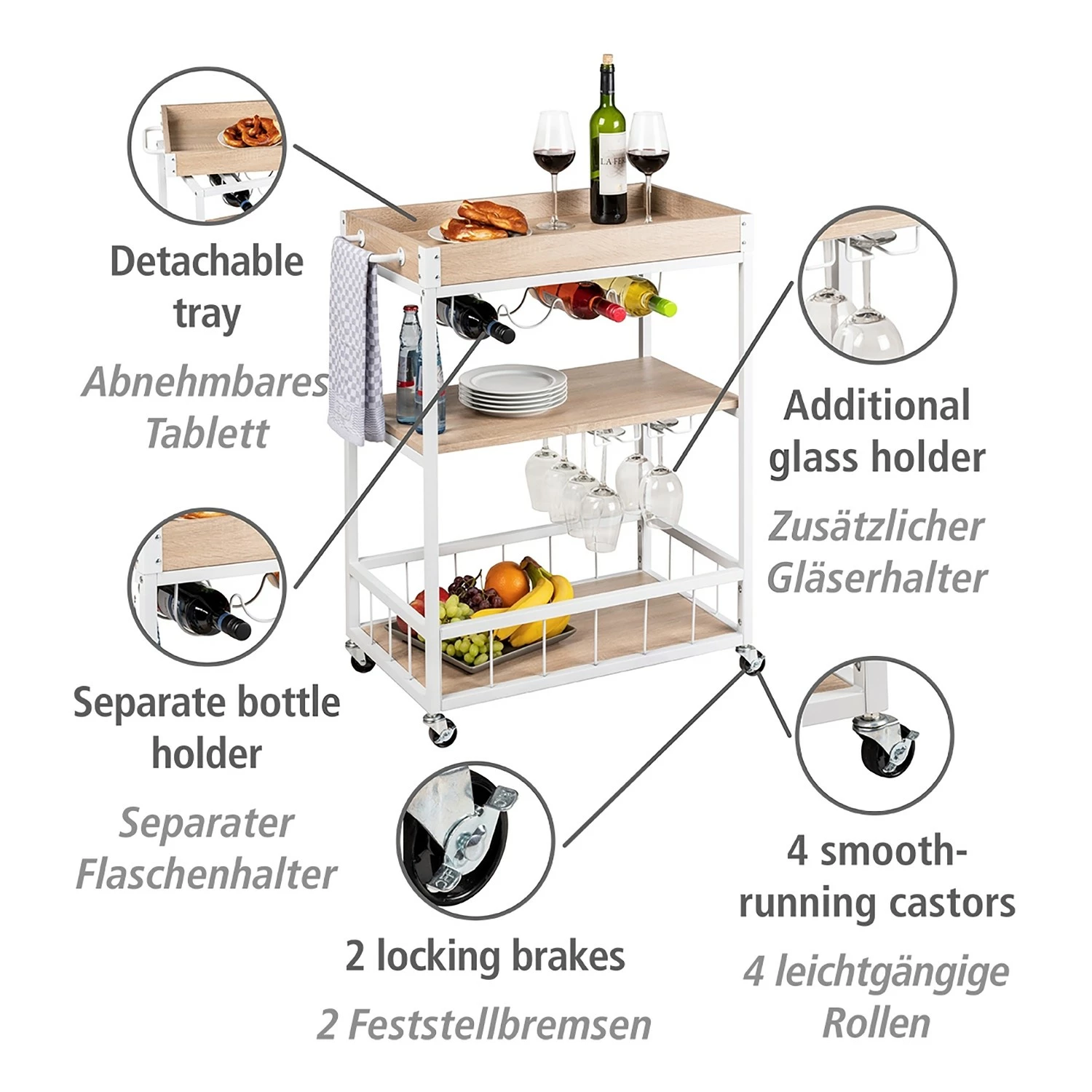 - ĂtagĂšres et plateau : MDF (panneau de fibres Ă densitĂ© moyenne) plaxĂ©